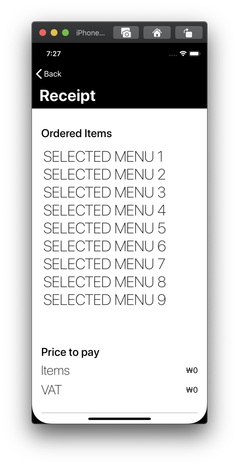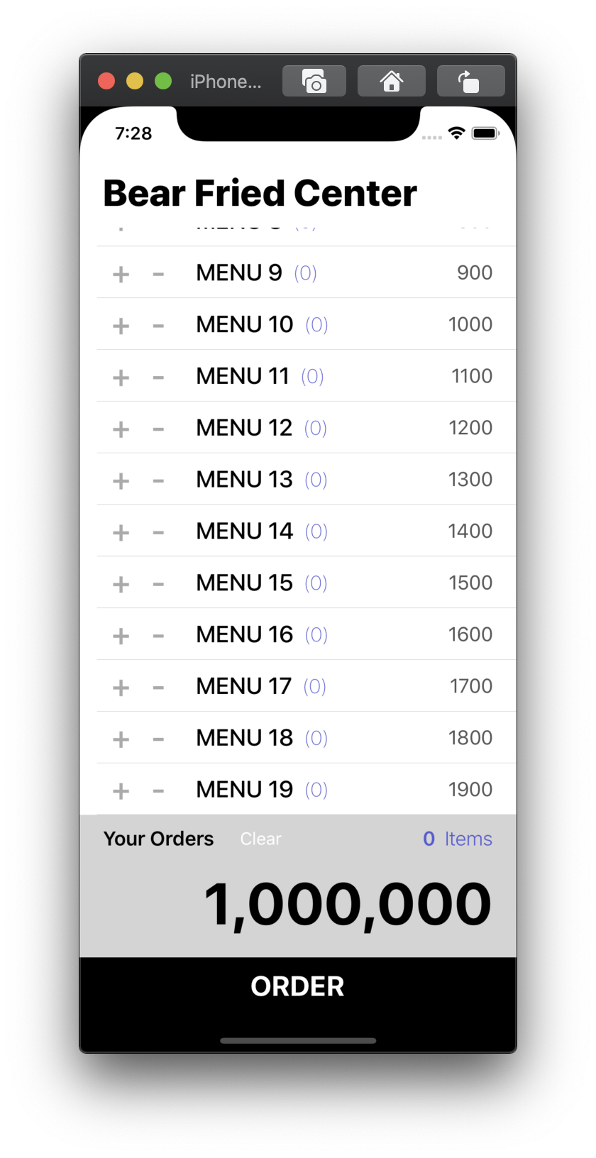 각 메뉴들이 있고 매뉴의 개수를 늘이고 줄일 수 있으며 이러한 결과에 따라 가격과 최종 주문 화면이 바뀌는 방식입니다. 하지만 지금은 이러한 방식으로 돌아간다는 것만 알 뿐 실제로 아무런 동작도 하지 않는 화면입니다. 따라서 이 화면에 RxSwift를 적용시켜 보겠습니다.