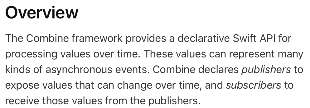 'Combine' 프레임워크는 시간이 지남에 따라 값을 처리하기 위한 선언적 스위프트 API를 제공한다. 이러한 값은 여러 종류의 비동기 이벤트를 나타낼 수 있습니다. 게시자를 결합하여 시간이 지남에 따라 변경될 수 있는 값을 노출시키고, 가입자는 게시자로부터 해당 값을 수신합니다.