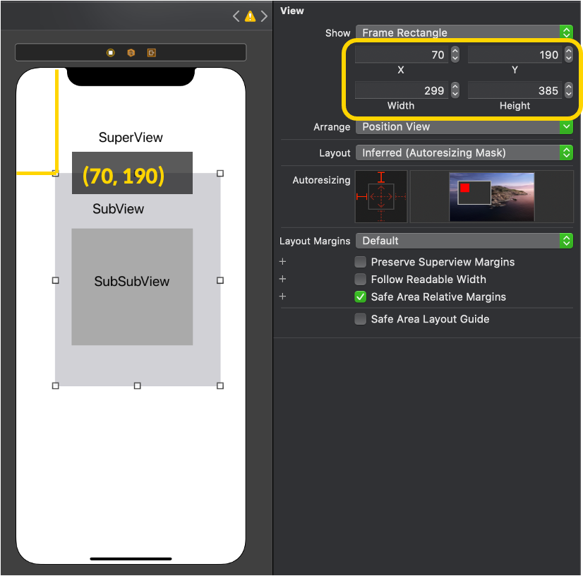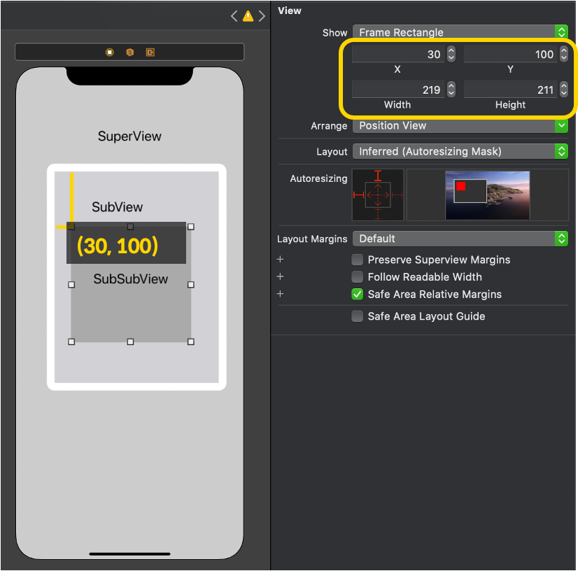 그리고 SubView를 클릭했을 때 우측 Inspector Area에서는 다음과 같은 좌표계를 확인해 볼 수 있습니다.