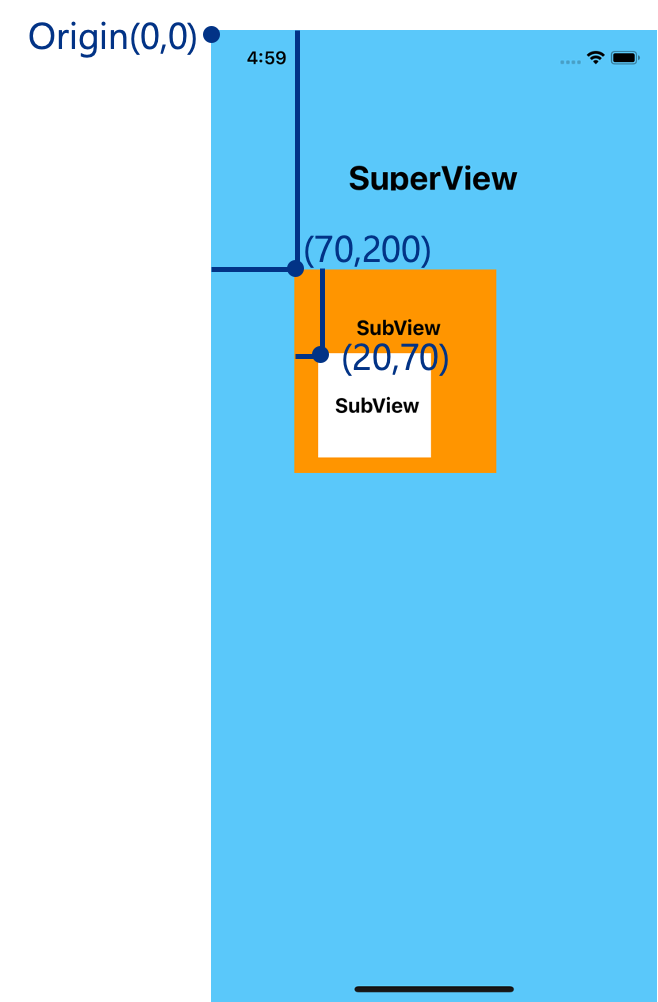또한 그 자식뷰의 자식 = SubSubView에서는 SubView의 Origin(좌측 최상단)을 기준으로 좌표계가 표현되어 있는 것을 볼 수 가 있죠.