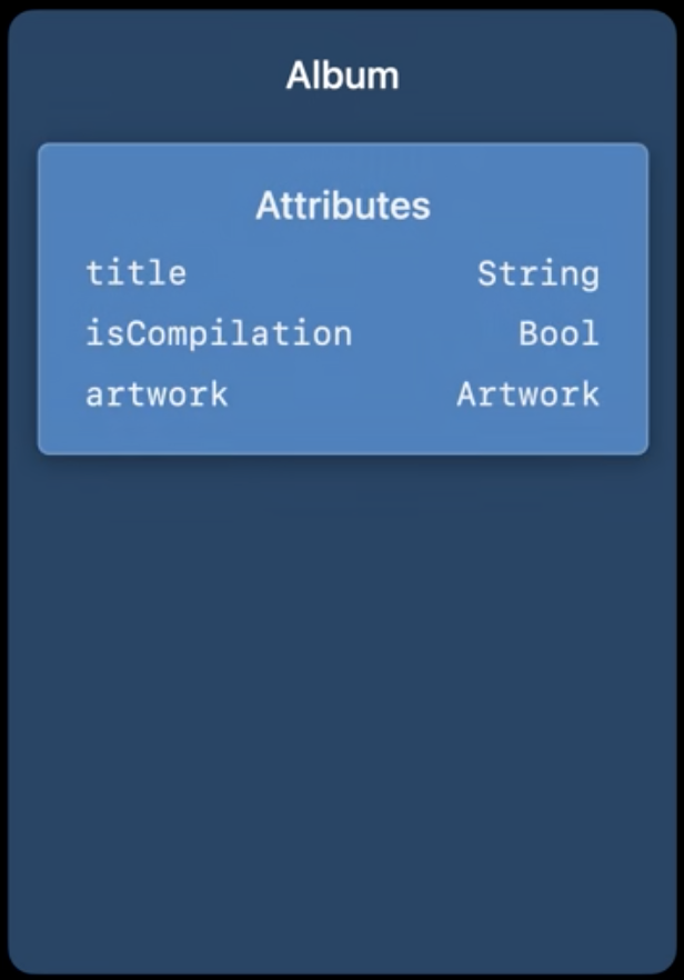 Album은 세가지 카테고리들로 그룹화된 값 타입의 구조 입니다. 속성들을 살펴보면 title, isCompilation, artwork가 있는데, artwork의 경우에는 크기정보 및 관련 색상과 아트워크 이미지 URL에 엑세스할 수 있는 구조를 가지고 있습니다.