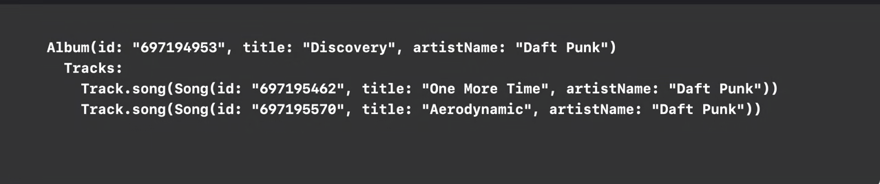 먼저 '.artists, .track' 과 같은 속성들을 통해 필요한 정보를 filter할수 있으며, with 메소드는 Swift 5.5의 동시성 코드를 통해 비동기 적인 데이터를 받아올 수 있습니다. 이렇게 받온 앨범 데이터에서 tracks데이터를 일반 배열과 같이 사용할 수 있습니다. 위 코드의 결과는 아래와 같습니다.