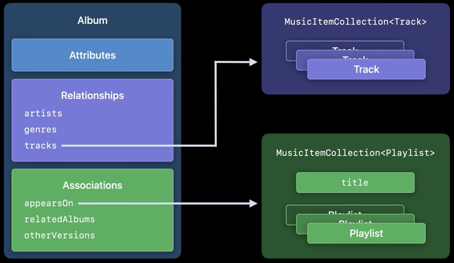 MusicKit은 Apple Music API에서 콘텐츠를 가져올 수 있는 구조화된 요청을 통해 음악 항목에 엑세스할 수 있는 새로운 모델 계층을 제공합니다. 이러한 새로운 모델 계층을 통해 Apple Music 카탈로그의 컨텐츠를 검색하거나, 특정 필터에 따라 리소스들을 가져올 수 있게 됩니다. 이러한 요청들은 Collection으로 그룹화된 응답이며, pagination과 같은 기능도 제공합니다.