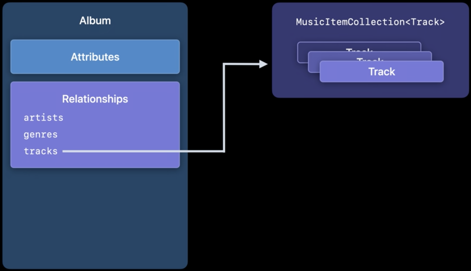앨범은 또한 아티스트, 장르, 앨범의 트랙목록과 같은 relationship 을 제공합니다. 예를 들어 트랙의 경우, Track이라는 타입의 Collection 형태로 제공됩니다.