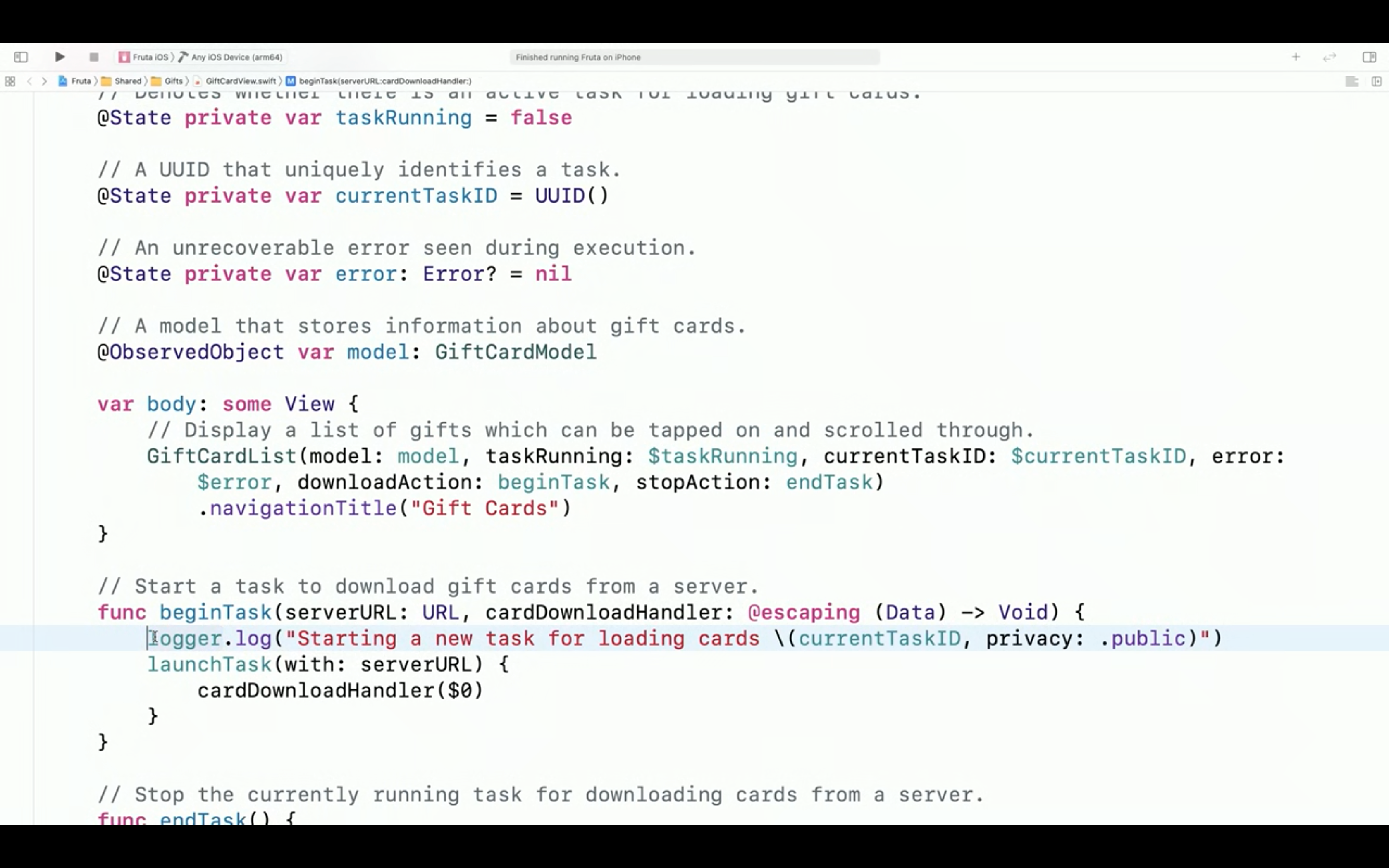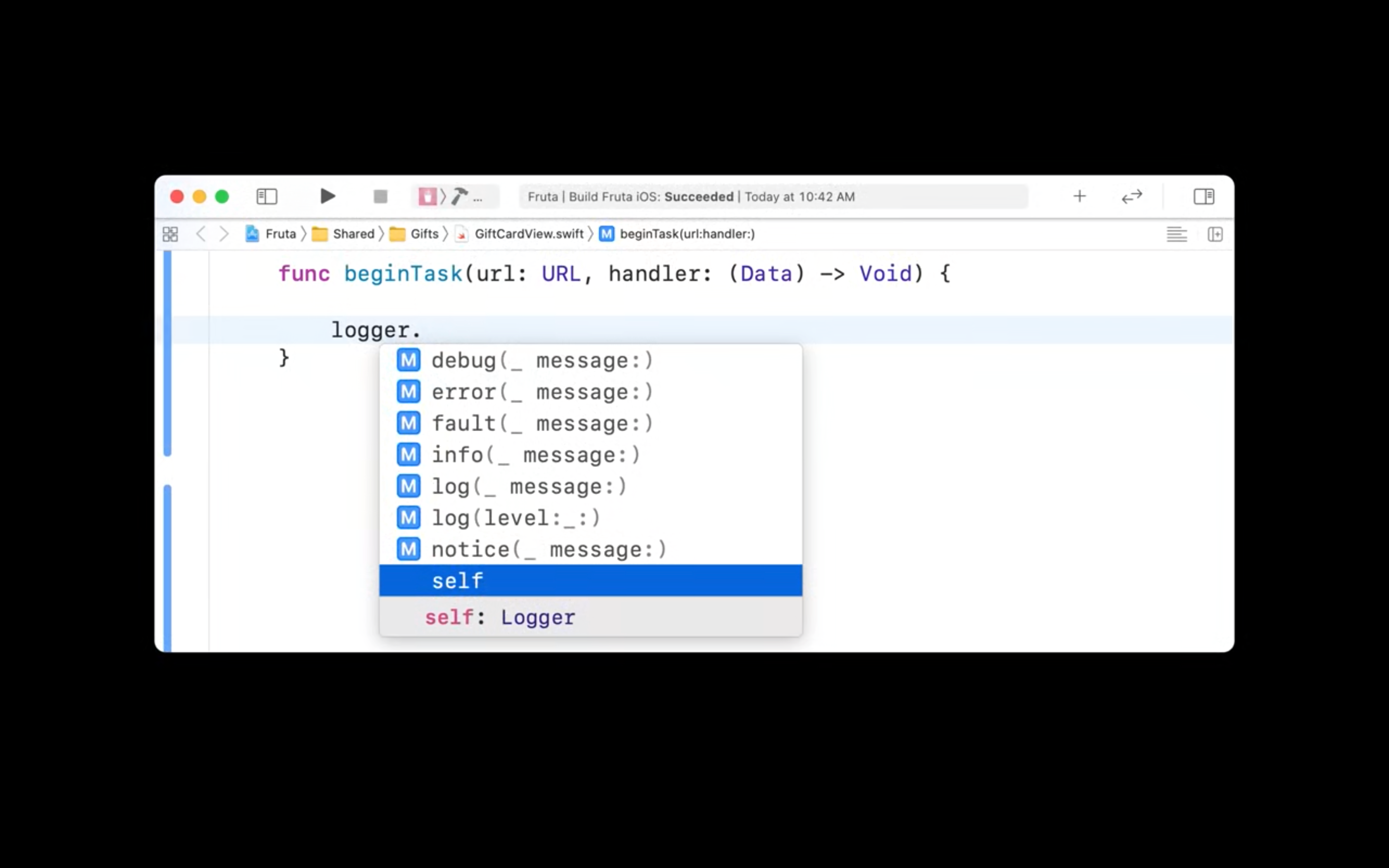 let logger = Logger(subsystem: "com.example.Fruta", category: "giftcards") // 2