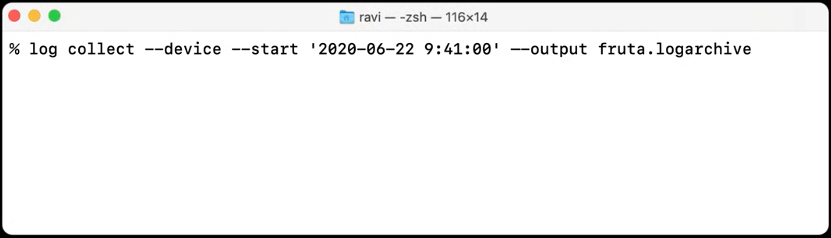 앱에서 생성된 로그 메세지를 운영체제에서 압축한 형태로 장치에 저장하고, Mac에서는 'log collect' 명령을 사용하여 해당 로그를 검색할 수 있습니다. 검색하는 방법은 먼저, 장치를 Mac에 연결하고, 터미널에서 다음과 같이 실행합니다.