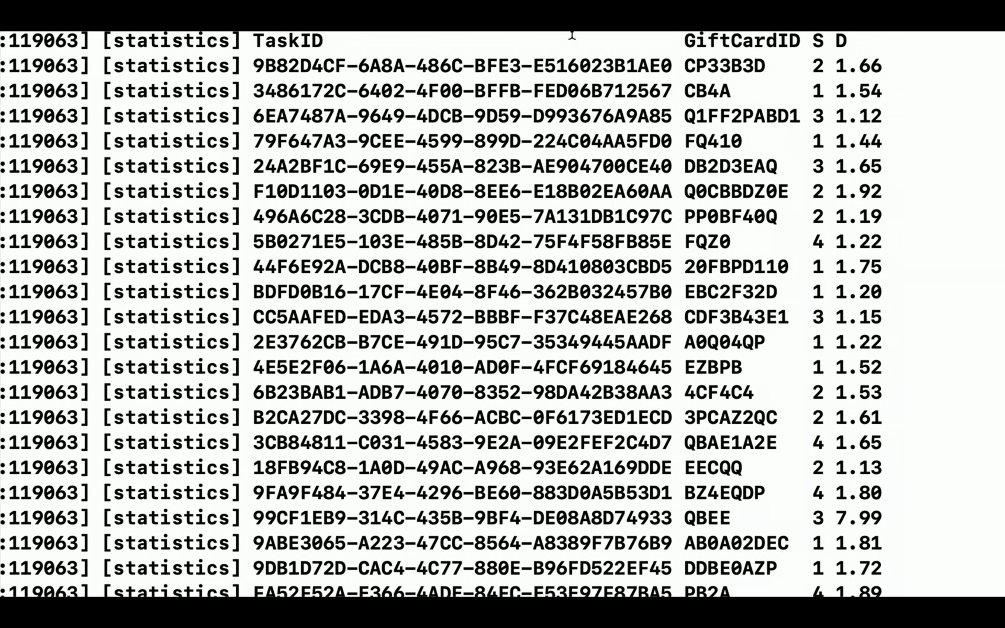 func logStatistics(taskID: UUID, giftCardID: String, serverID: Int, seconds: Double) {