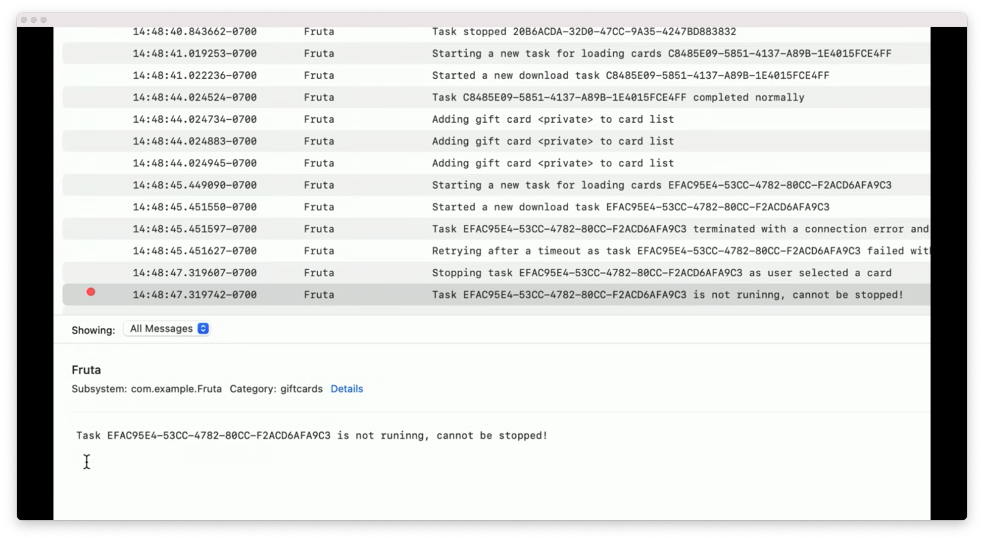 위 과정에서는 앱이 더많은 기프트 카드를 가져오기 위한 작업을 시작하였으나, 네트워크 에러로 인해 작업이 완료되었고, 시간 초과 후 다시 시도하려고 대기하고 있음을 알 수 있습니다. 하지만, 사용자는 기프트 카드에서 어떠한 항목을 선택했고, 이로 인해 활성된 작업을 중지되도록 하였습니다. 하지만 이 시점에는 활성된 작업이 존재하지 않으므로 실패하게 됩니다. 이렇게 버그가 발생한 상황을 살펴보고 개발자는 알맞는 조치를 취할 수 있게 될 것 입니다.