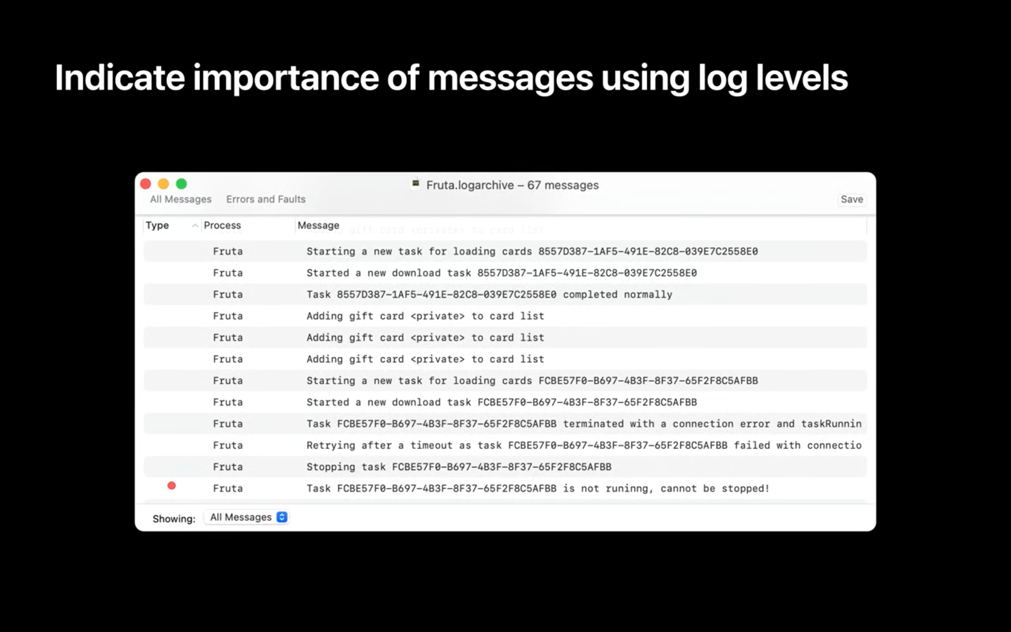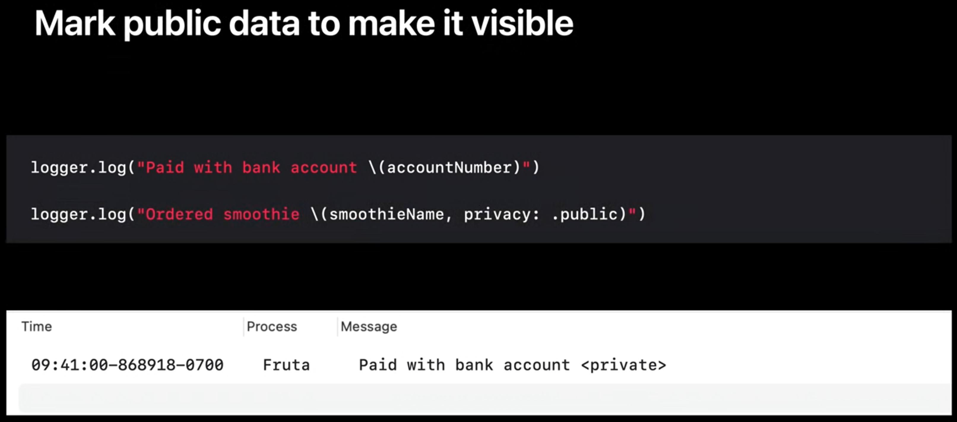 다음과 같이 로그를 사용하여 메세지 내부에 런타임 데이터를 추가할수도 있습니다. 이러한 방식은 일반적으로 런타임 데이터를 체크하기 위해 print 문을 사용하는 것과 비슷하다고 볼 수 있습니다. 이러한 데이터는 로그 메세지에 다양한 형태로 포함이 가능하고, 'CustomStringConvertible' 프로토콜을 준수하는 모든 타입 뿐만아니라 Int 나 Double 같은 숫자를 기록할 수 있습니다. 즉, 로그 메세지에 사용자가 설정한 타입을 추가하려면 'CustomStringConvertible' 프로토콜을 준수해야 합니다.