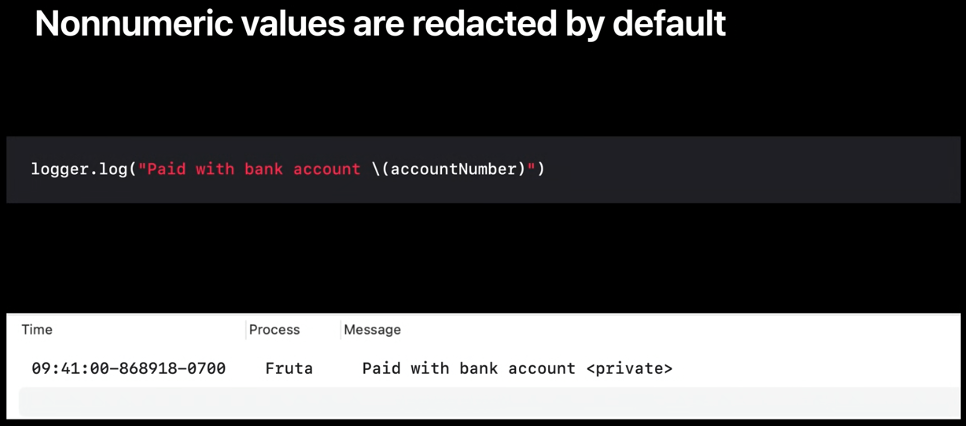 다만, 런타임 데이터를 로그메세지에 추가할 경우 사용자 개인정보고 표시되지 않도록, 문자열 같이 숫자가 아닌 타입의 경우 로그에서 다시 처리됩니다. 예를 들어, 로그에서 계좌번호와 함께 메세지를 로깅했다면, 출력 로그에서는 계좌번호가 비공개로 수정됩니다.