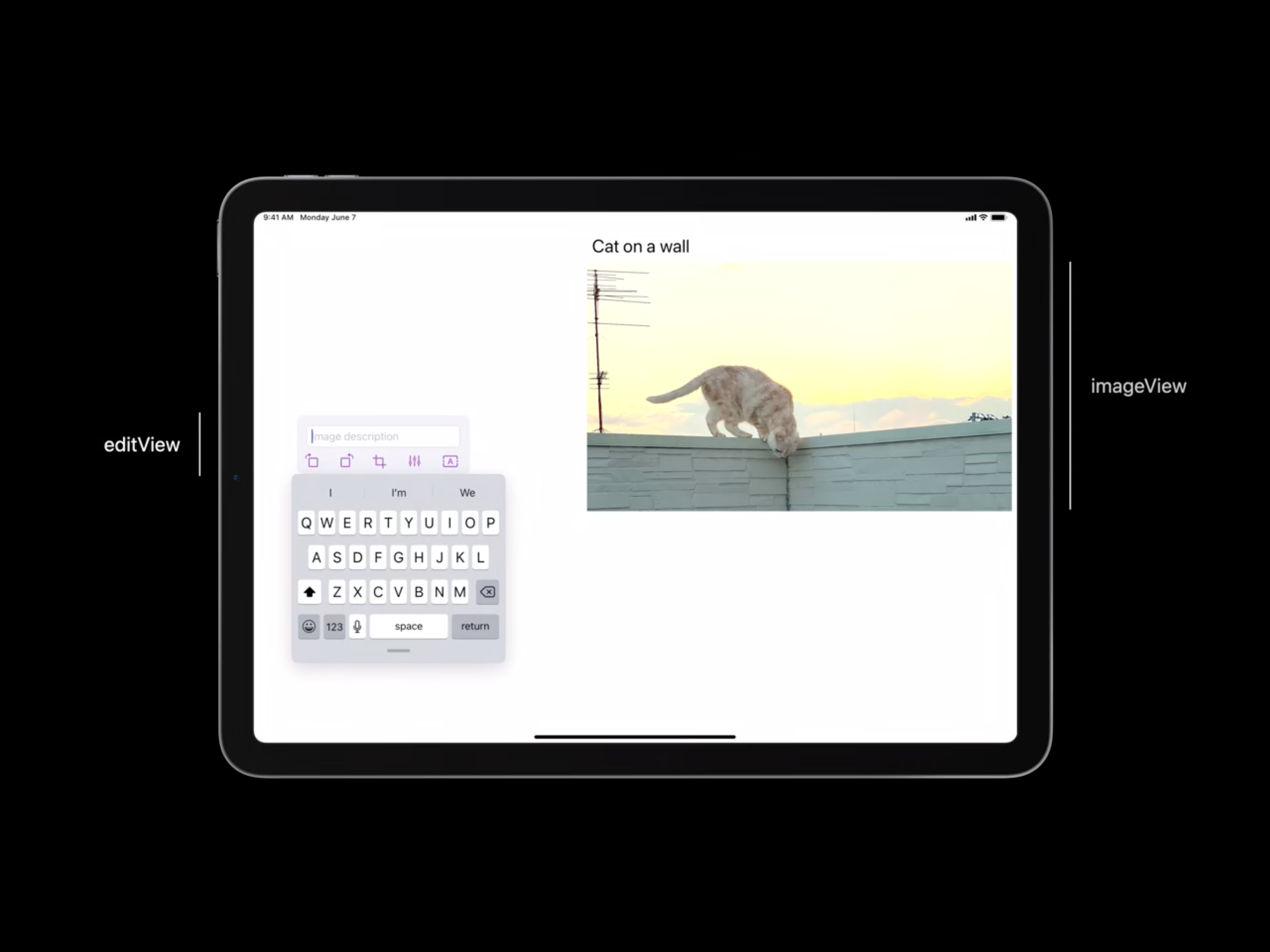 이제 코드를 살펴보도록 합시다. 아래 슬라이드에서 editView는 텍스트 필드와 컨트롤들이 있는 뷰 이고, imageView는 이미지 뷰 입니다.
