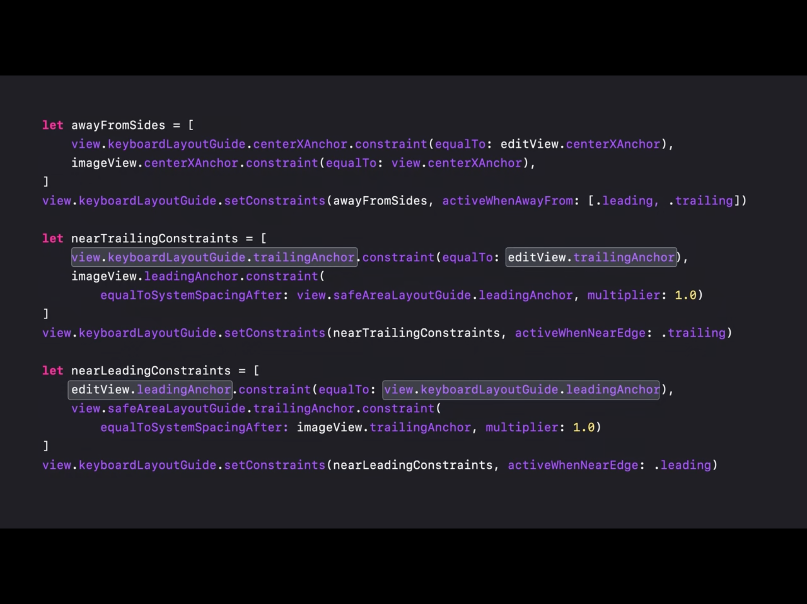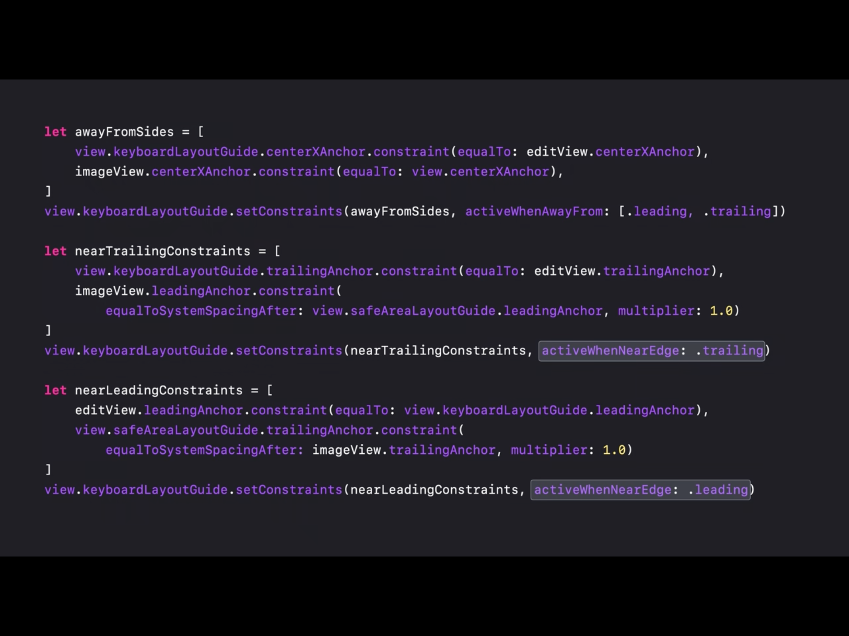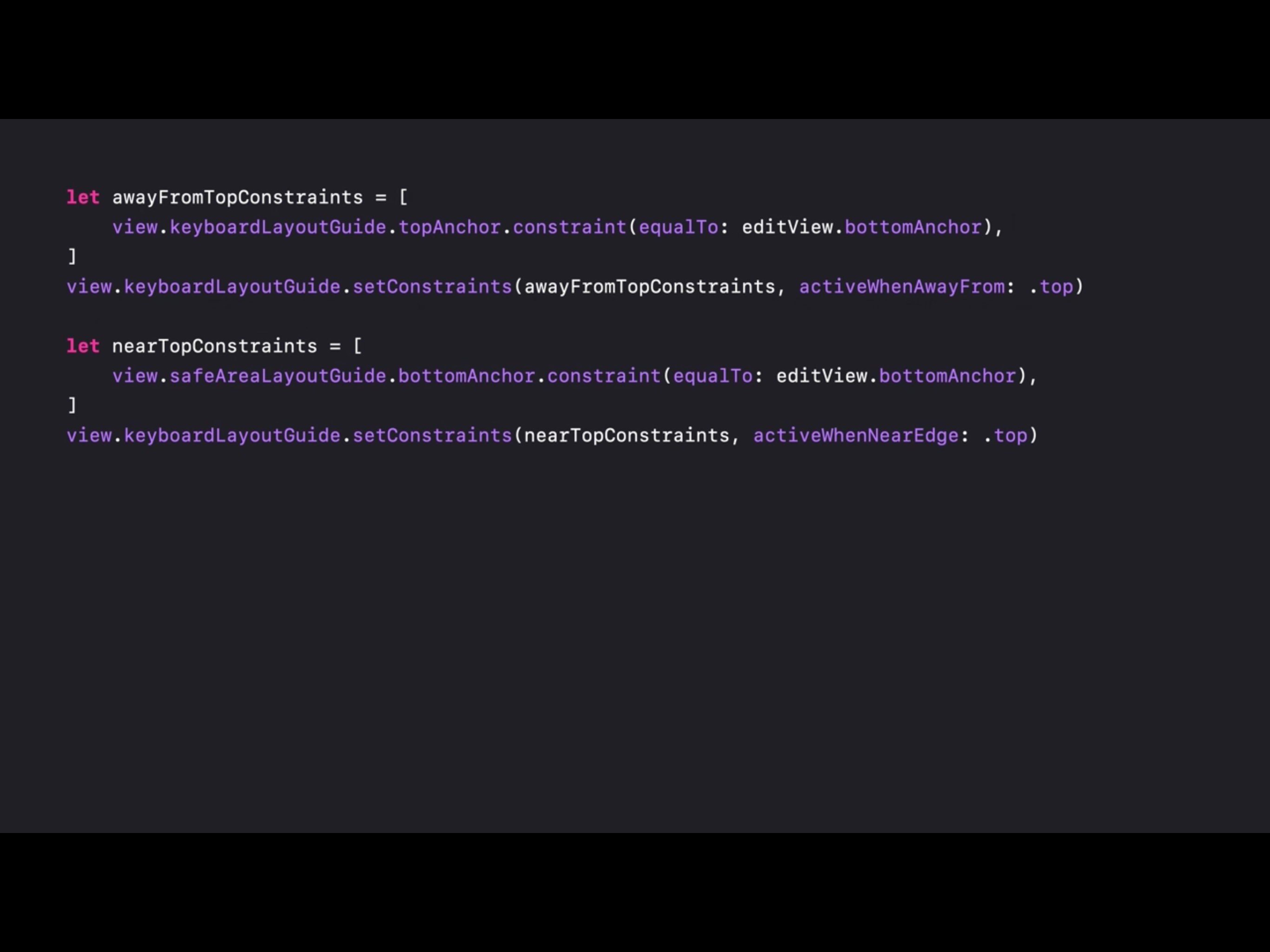 처음으로 editView의 하단을 키보드 레이아웃 가이드의 상단과 연결하는 배열을 선언합니다. 그런 다음 가이드가 위에서 떨어져 있을 때만 활성화되도록 설정하여 가이드가 top에 가까이 있을 때 비활성화 하도록 합니다. 그런 다음 키보드가 상단에 가까워 질 때 사용할 별도의 제약조건 배열을 정의하고, safe-area의 하단 부분과 오토레이아웃을 적용시킵니다.