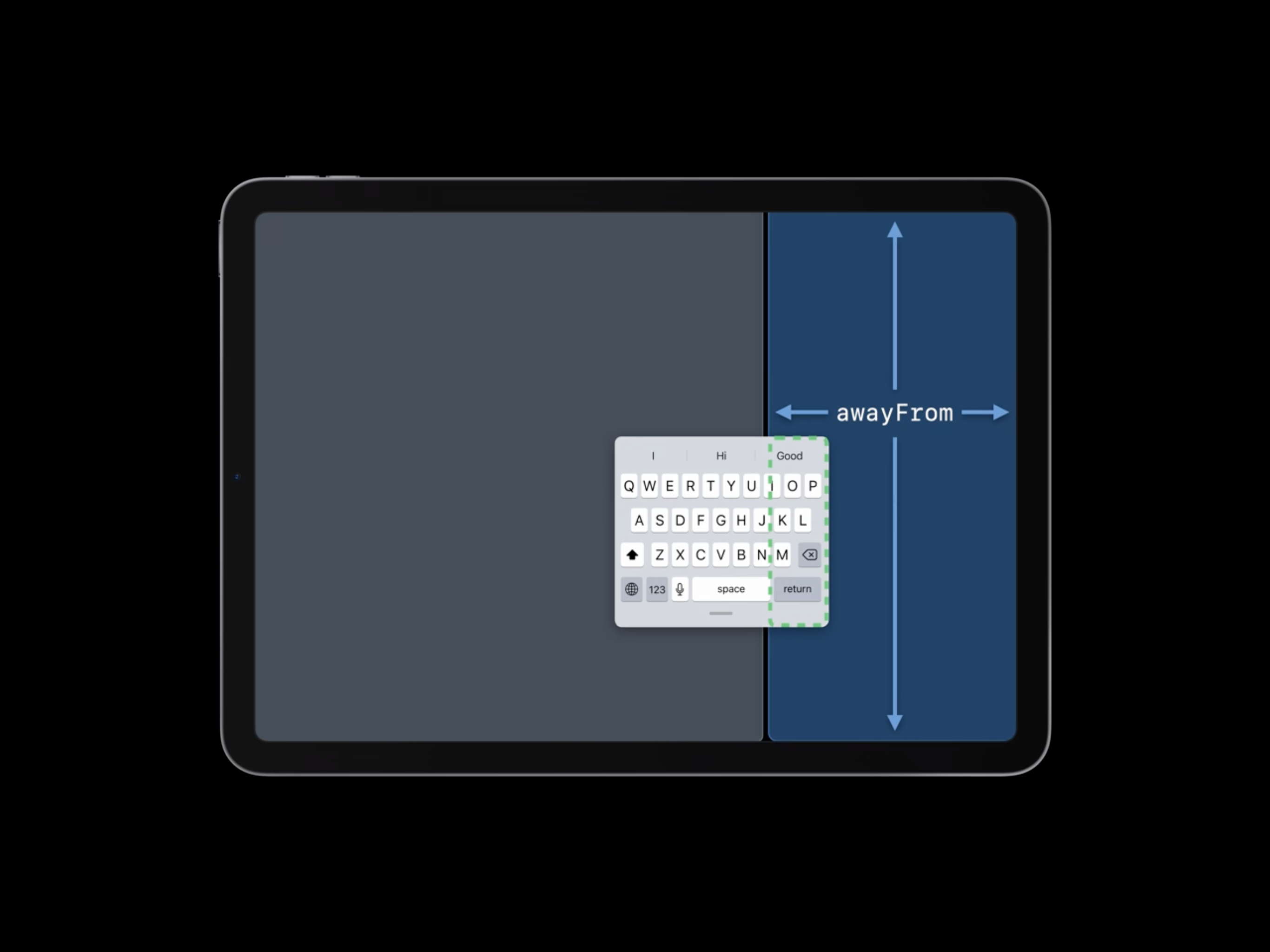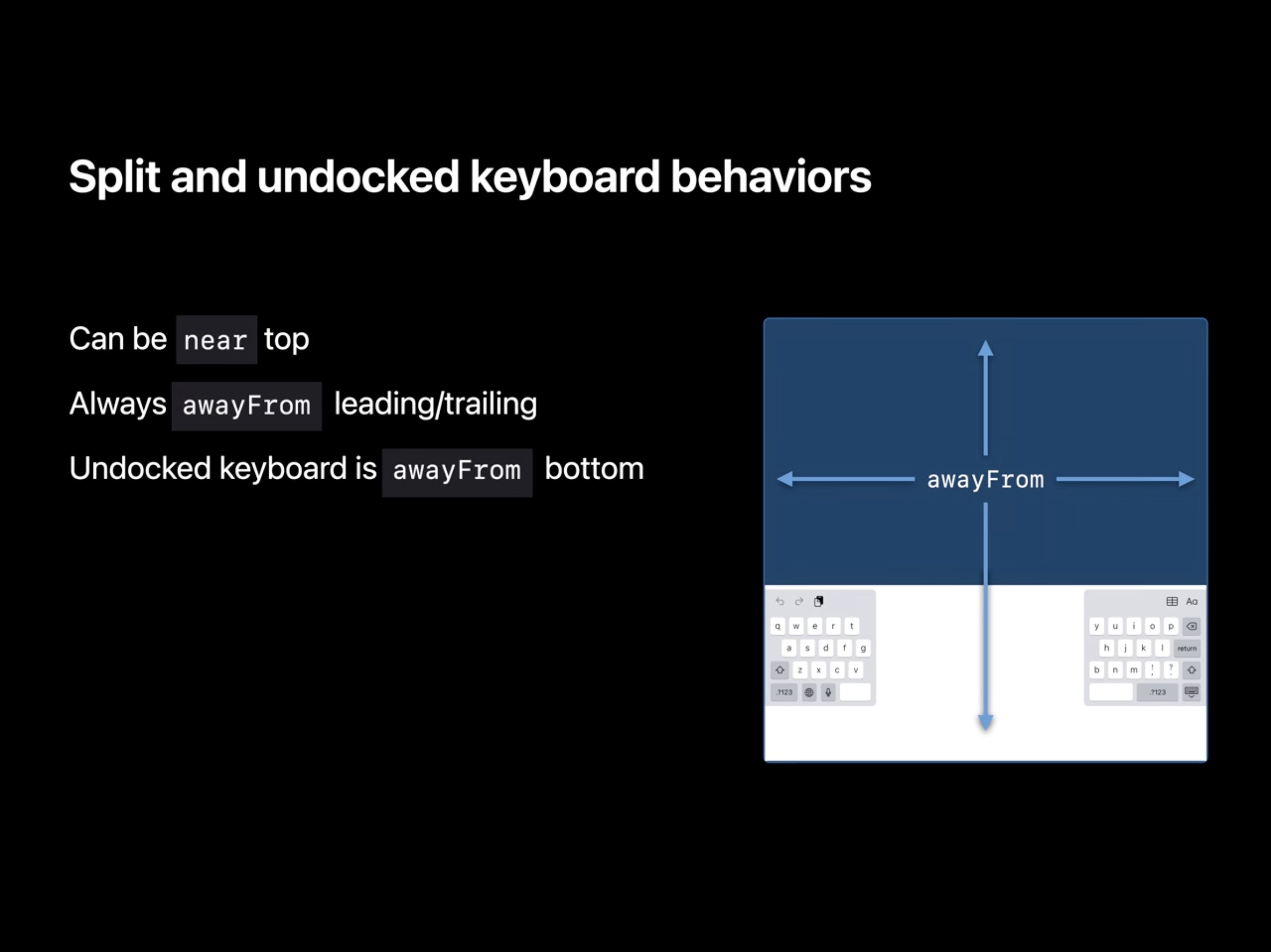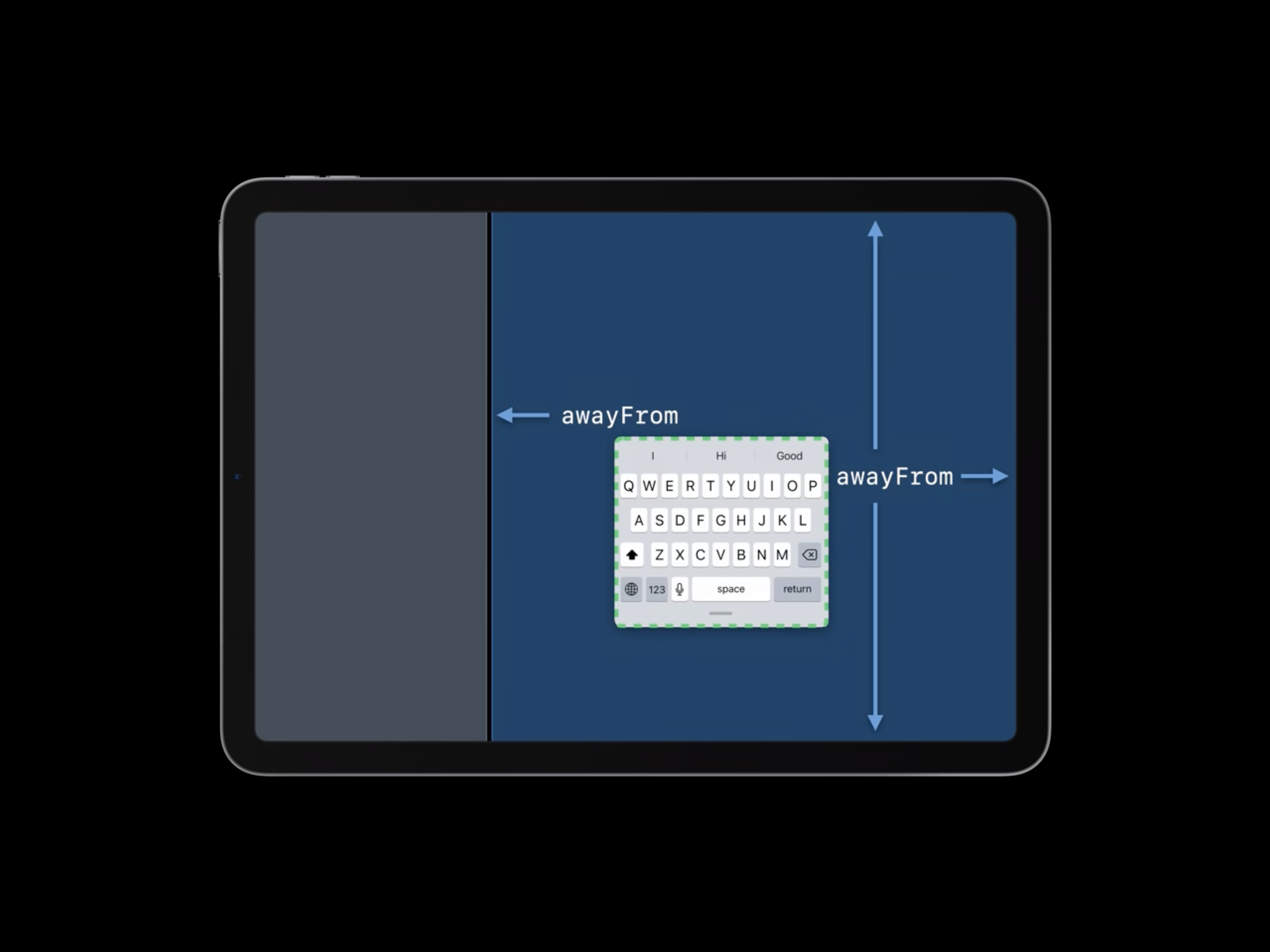먼저 고려할 점은 키보드가 앱의 공간을 떠날 수 있다는 것을 기억해야 합니다. 만약 그렇다면 키보드는 dismiss 된 것처럼 취급 됩니다. 그리고 앱이 가장 좁은 형태일 때는 top과 bottom의 엣지가 유효 하지만, 키보드가 앱 위에 있는지 여부와 관계 없이 leading과 trailing은 awayFrom 상태가 됩니다.