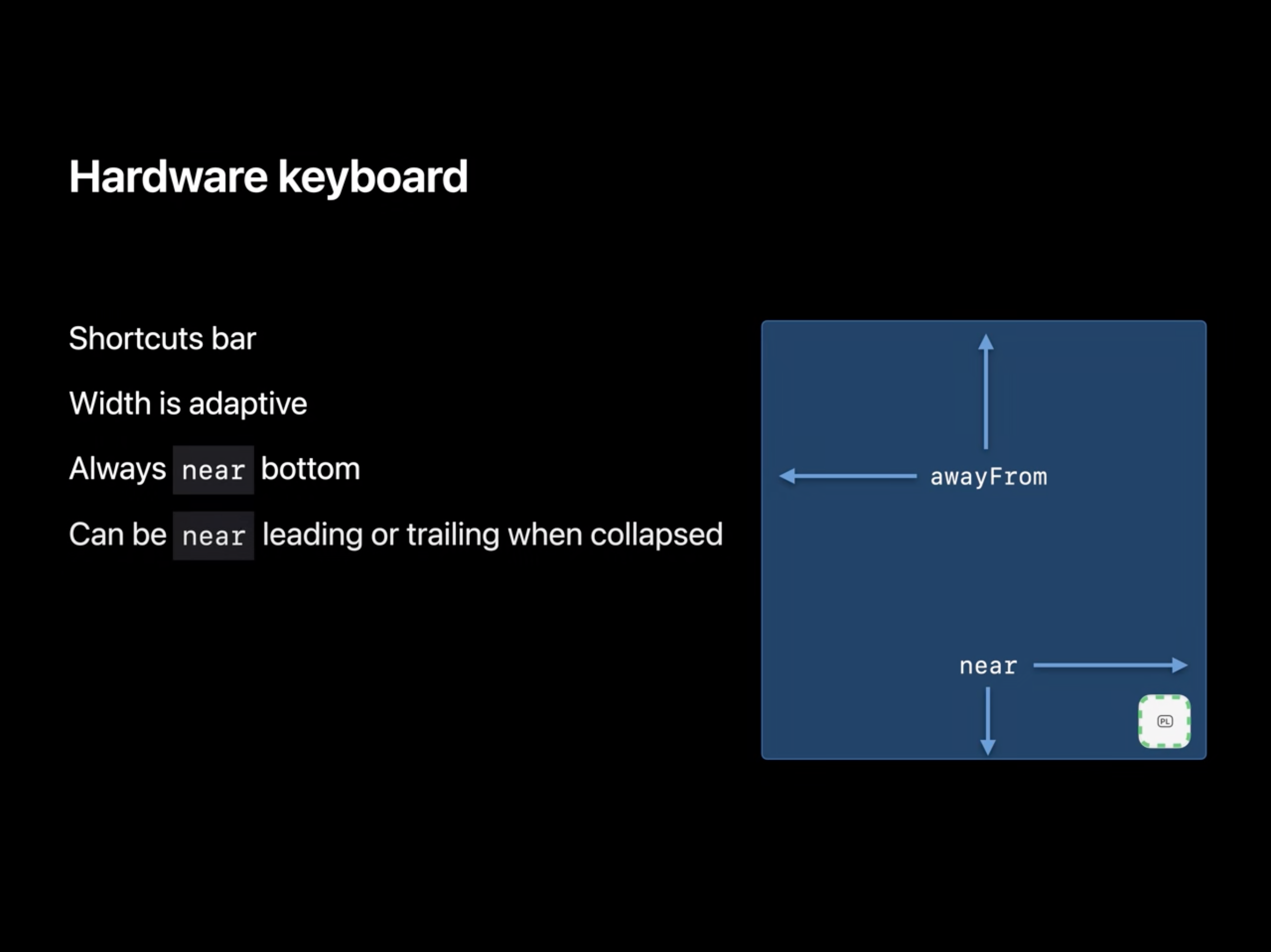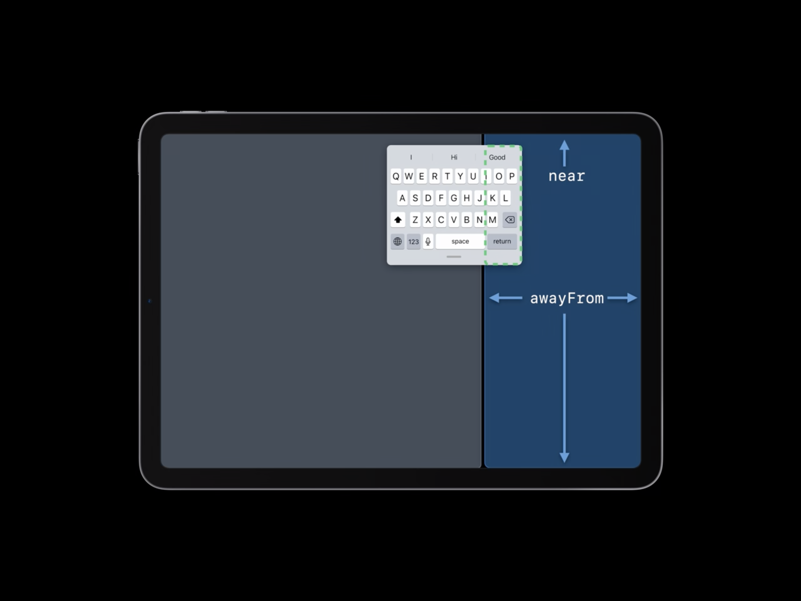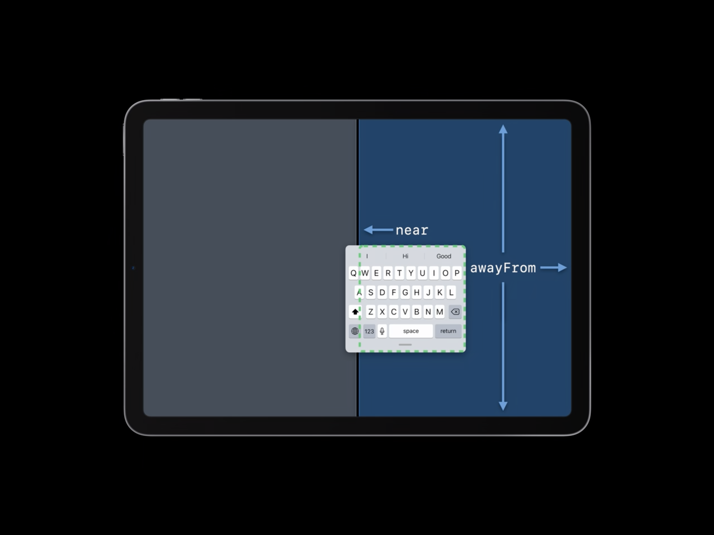먼저 고려할 점은 키보드가 앱의 공간을 떠날 수 있다는 것을 기억해야 합니다. 만약 그렇다면 키보드는 dismiss 된 것처럼 취급 됩니다. 그리고 앱이 가장 좁은 형태일 때는 top과 bottom의 엣지가 유효 하지만, 키보드가 앱 위에 있는지 여부와 관계 없이 leading과 trailing은 awayFrom 상태가 됩니다.