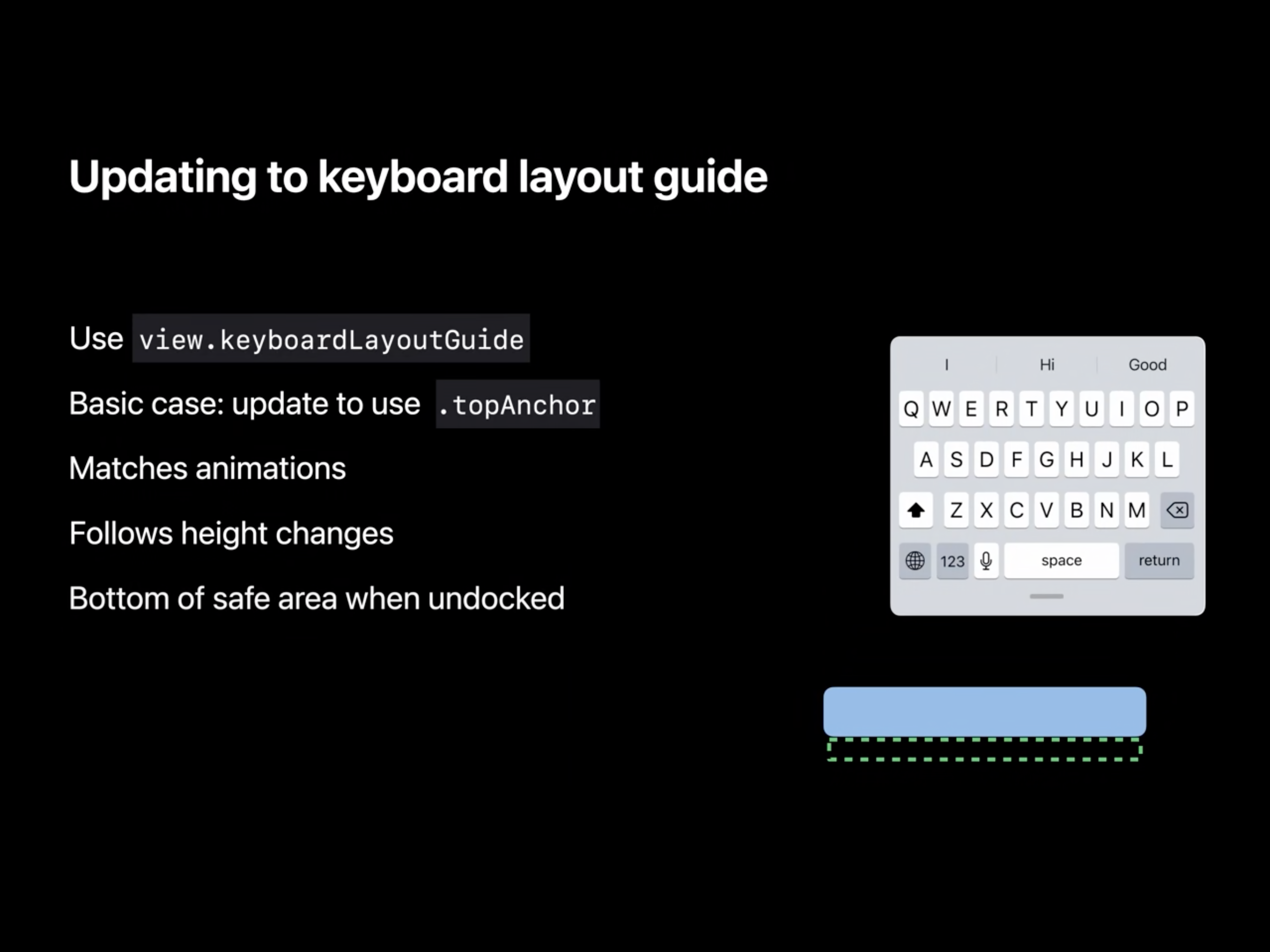 이 keyboardLayoutGuide 프로퍼티는 UIView에 있는 속성입니다. 대부분의 경우에 이 topAnchor를 사용하도록 업데이트하기만 하면 됩니다. 이 가이드는 키보드 키보드가 올라오고 내려오는 애니메이션과도 매치됩니다. 그리고 변화하는 높이도 따릅니다. 때때로 키보드의 높이는 변화하는데, 이에 대해 어떠한 사이즈에도 매치가 되도록 합니다. 그리고 키보드의 도킹이 해제될 때 가이드는 화면 아래쪽으로 내려오게 되고 상단 앵커에 묶인 항목들은 모두 내려옵니다.
