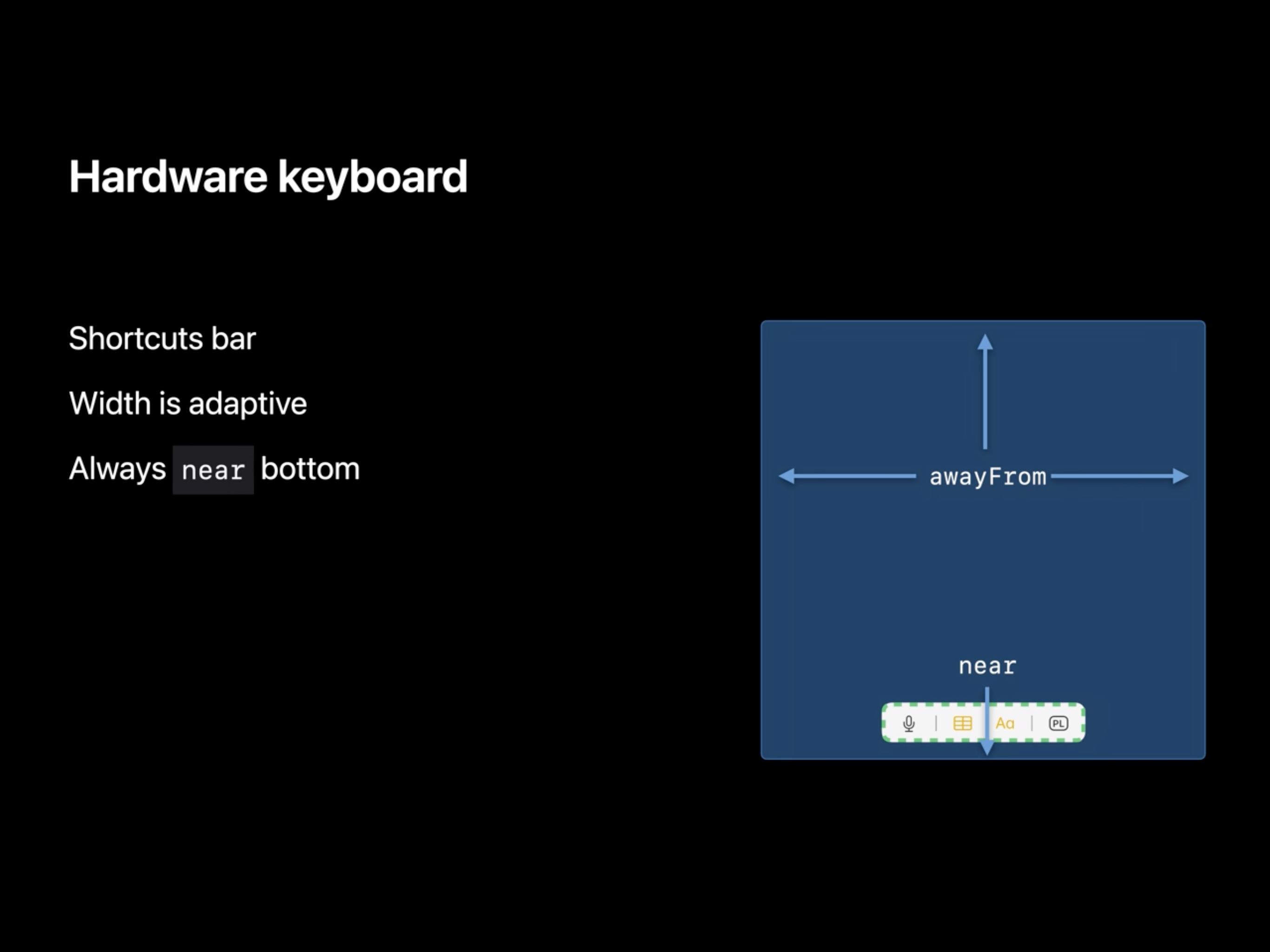 애플에서는 왜 이러한 새로운 레이아웃 가이드를 선택하였을 까요? 영상의 개발자는 키보드를 많은 용도로 사용하길 바라기 때문이고, 이러한 확장된 키보드를 앱에 통합하도록 하는 것이 다음 단계라고 이야기 합니다. 키보드 레이아웃은 몇몇 문제들이 많았고 이를 피해야 한다는 이야기를 종종 들었다고 합니다. 따라서 이러한 레이아웃 가이드를 새롭게 만든 동기 중 하나는 개발자에게 사용자가 텍스트를 입력할 수 있는 다양한 방법에 대해 대응할 수 있도록 기능을 제공하고, 키보드를 레이아웃의 일부로써 생각할 수 있도록 하기 위함이였다고 합니다.