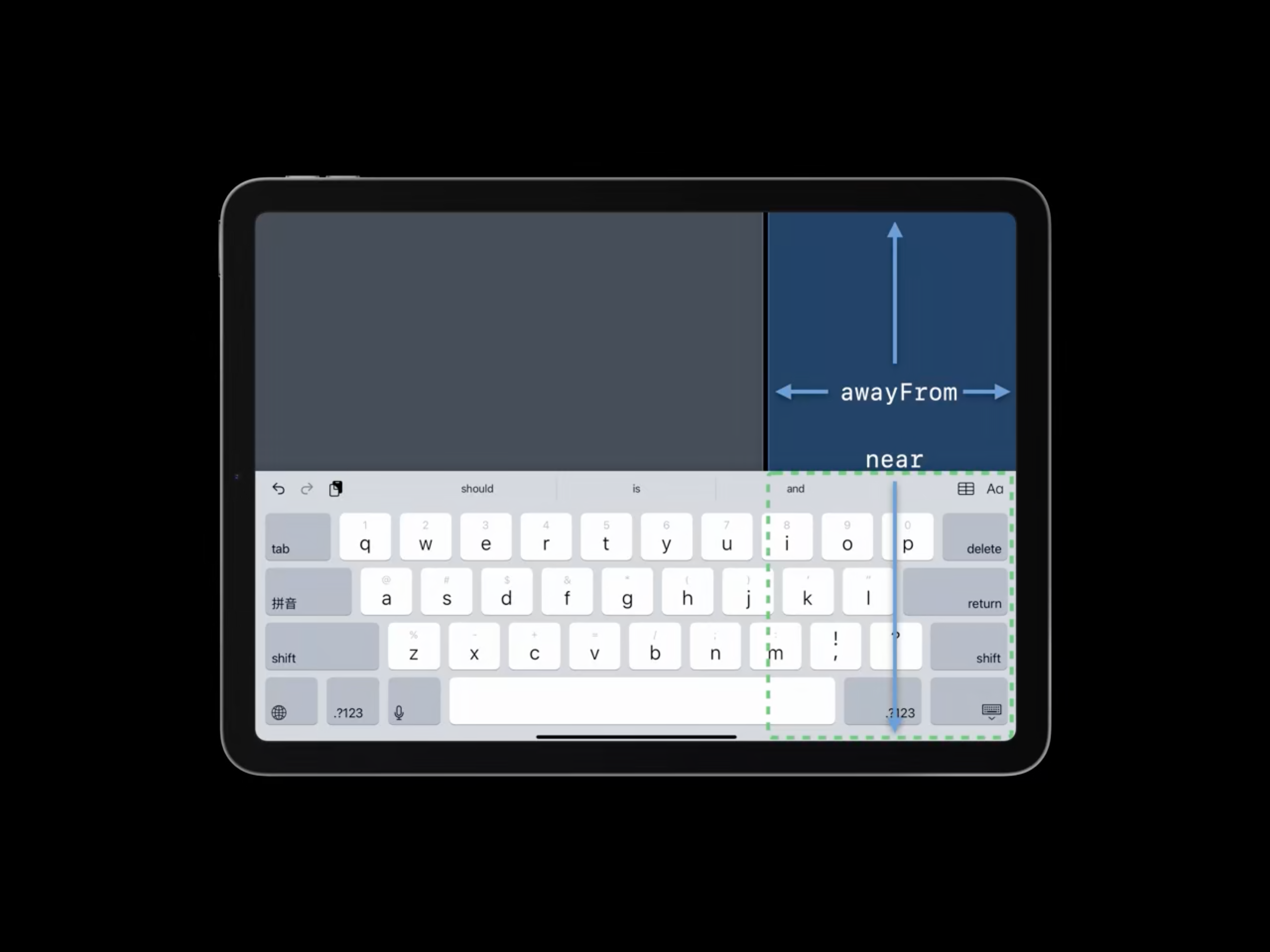 그리고 도킹 해제와 분할한 키보드는 모든 엣지에서 awayFrom 상태일 수도 있고 상단과 near 인 상태가 될 수 있으며 두개의 인접한 엣지와 near인 상태가 될 수 있습니다. 이러한 모든 것들은 followsUndockedKeyboard 설정이 true일 때만 가능합니다.