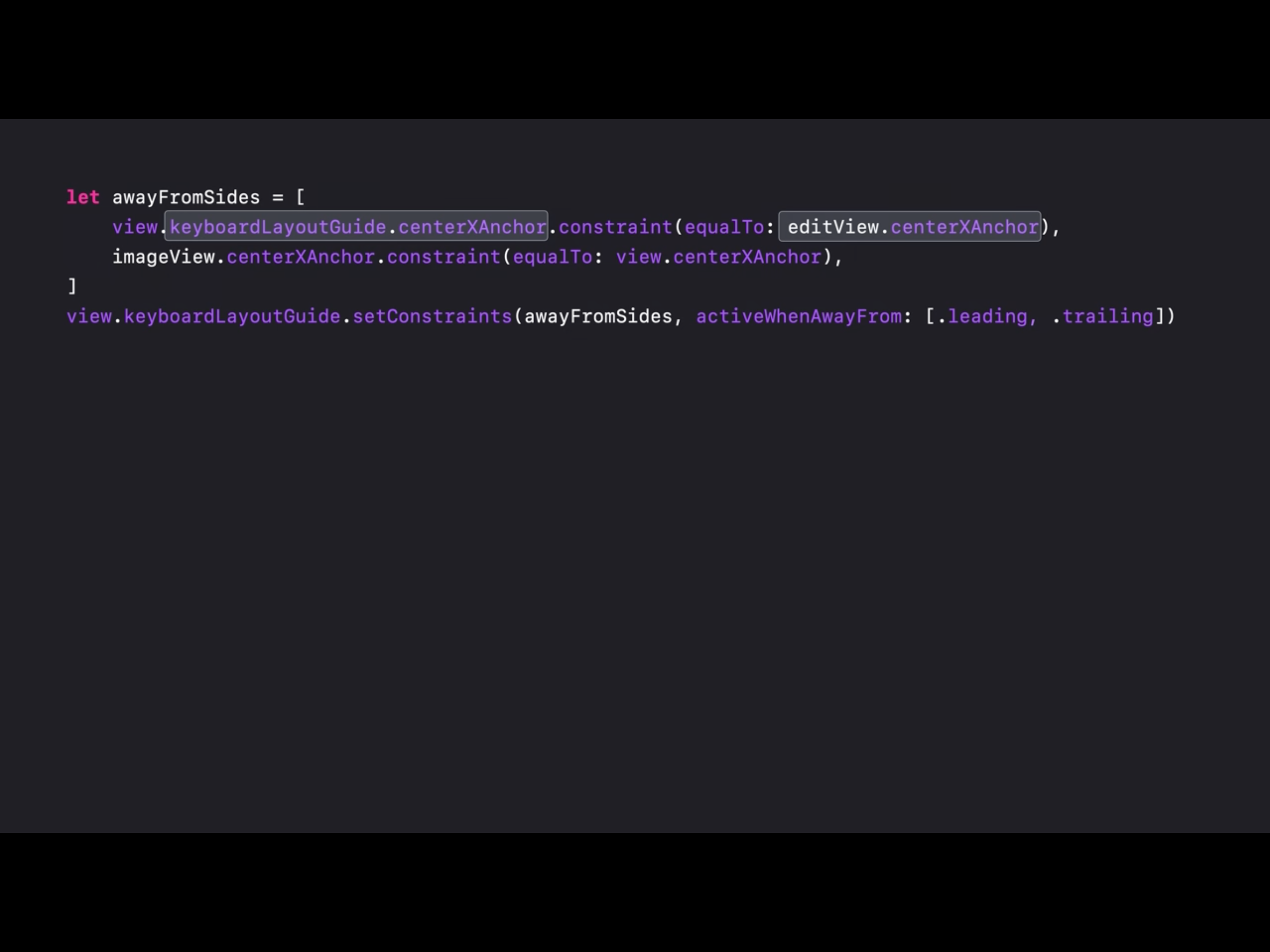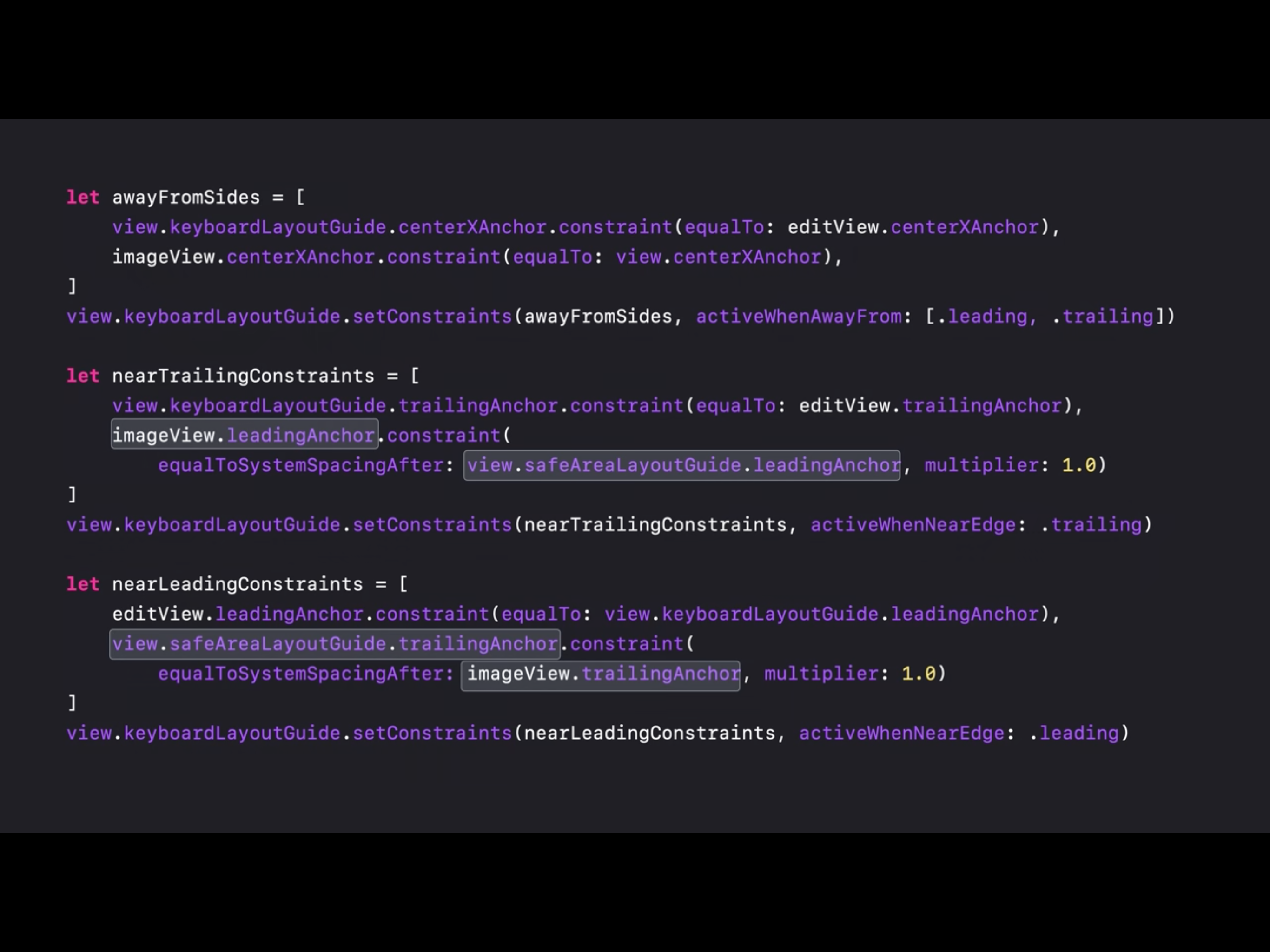 keyboardGuide.bottomAnchor.constraint(equalTo: view.bottomAnchor).isActive = truekeyboardGuide.topAnchor.constraint(equalTo: textView.bottomAnchor).isActive = truekeyboardHeight = keyboardGuide.heightAnchor.constraint(equalToConstant: view.safeAreaInsets.bottom)