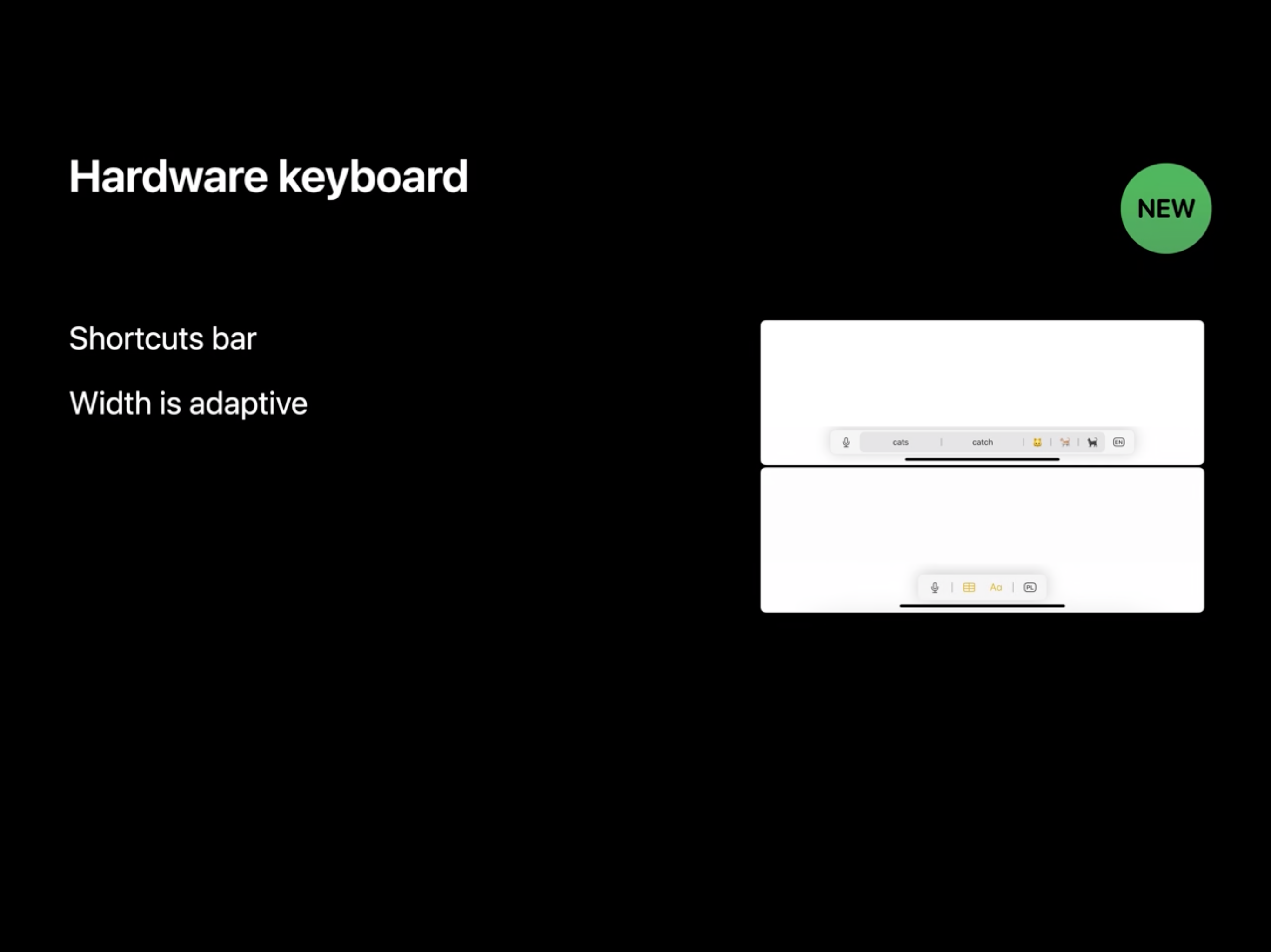 다음으로는 하드웨어 키보드가 부착되어 있는 경우는 어떨까요? 올해부터는 더이상 가득차있지 않고 적응형으로 단축기를 표시하는 bar를 갖게 되었습니다. 사용중인 언어와 단추 수에 따라 너비는 변경됩니다.